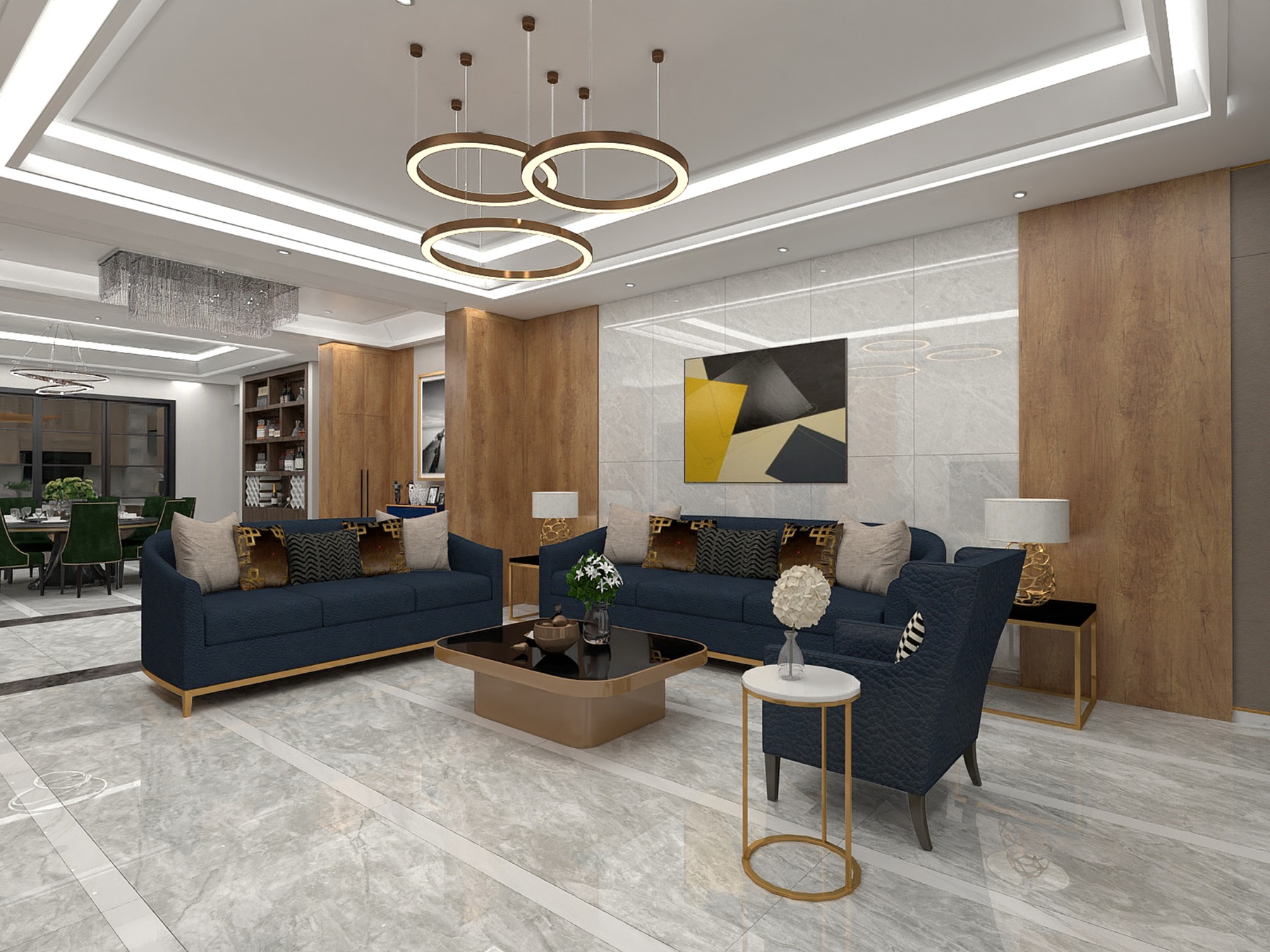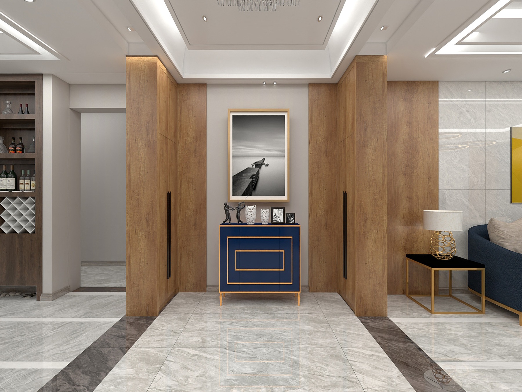 星河灰在空间中释放独属于自己的魅力。深蓝色的柜子和摆设为空间增添了一丝古典的韵味,墙上的挂画仿佛在构筑艺术之美。