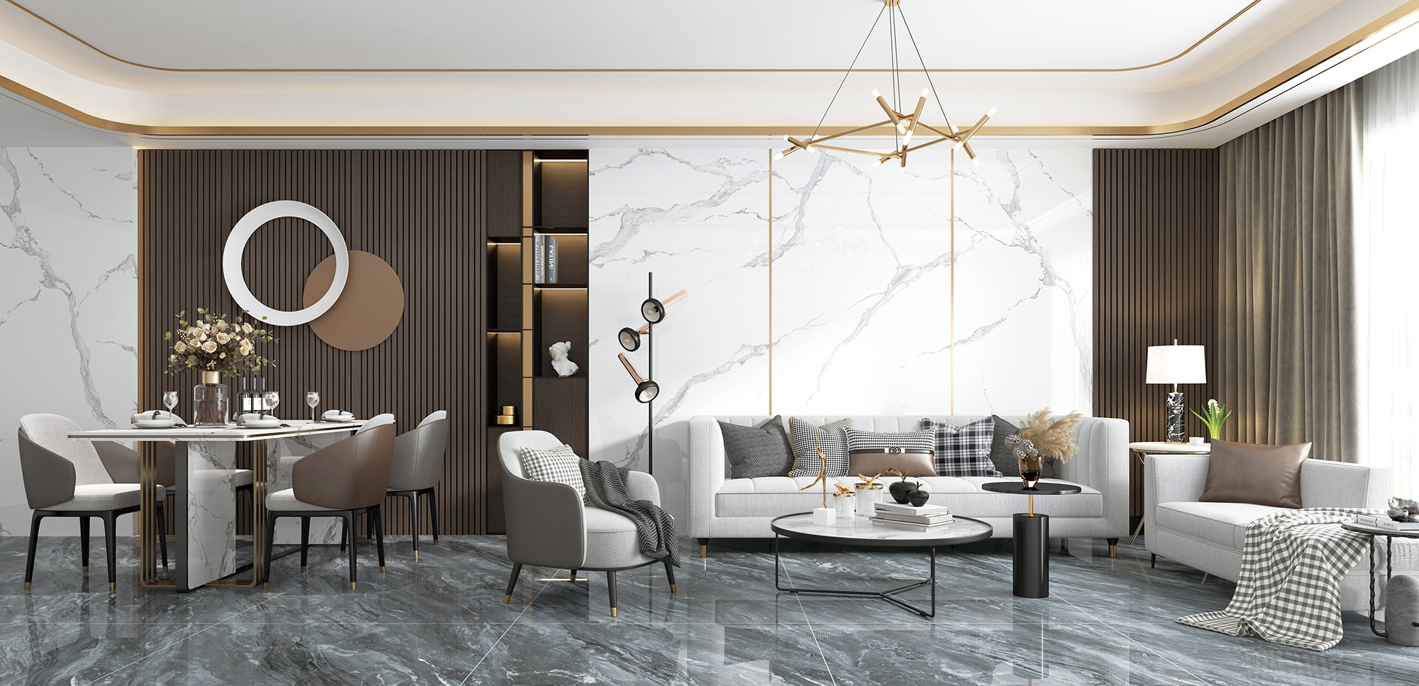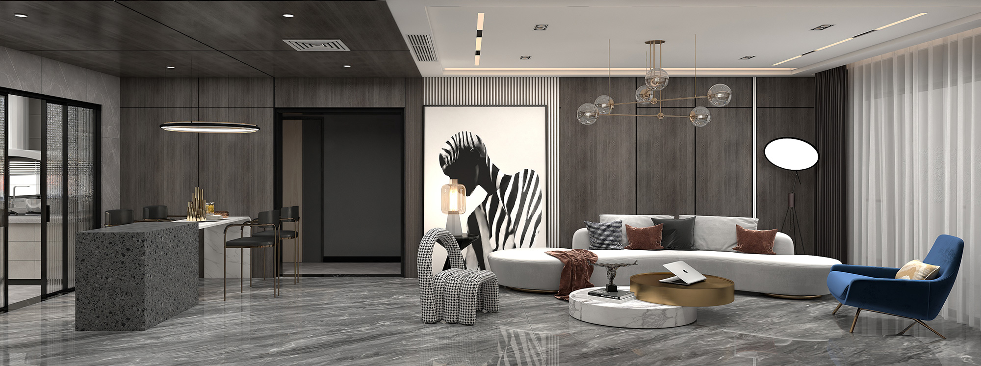 空间使用月岩灰和各种个性化金属元素作搭配,营造了一种现代摩登的氛围,整个空间环境无处不透露着高级感。