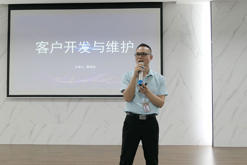 接着,集团高级讲师陈利发老师带来《客户开发与维护》精彩课程,陈老师从开拓新客户和维护客户两方面进行讲述。开拓新客户,既是销售重点,也是销售难点。陈老师从“在公司”和“出差”两方面展开讲解如何开拓新客户,他通过切身经历、成功案例、开拓方式、方法等传授开拓新客户的经验。