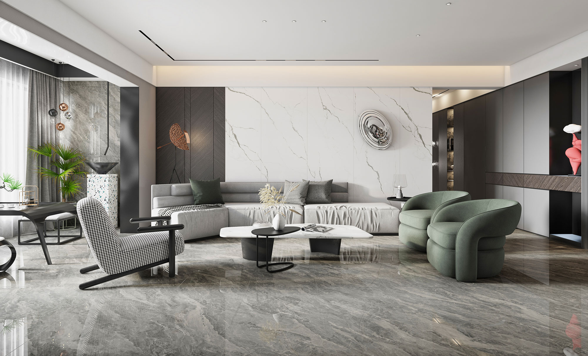 淡雅的多拉灰岩板,铺设出低调柔和的客厅氛围,再用优雅沉稳的深褐色和清新简约的浅绿色加以点缀,使空间变得高级且饱满。