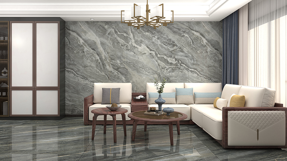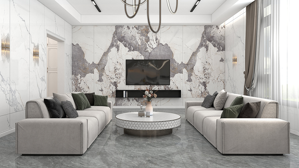 灰白相合的墙地,简约的浅灰沙发,营造出素雅时尚的风格,壮丽如山水的新潘多拉岩板背景墙,为这一抹素色点缀了不一样的风景,让简约中多了点轻奢。
