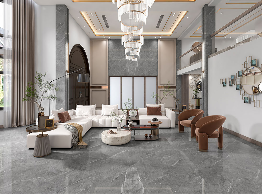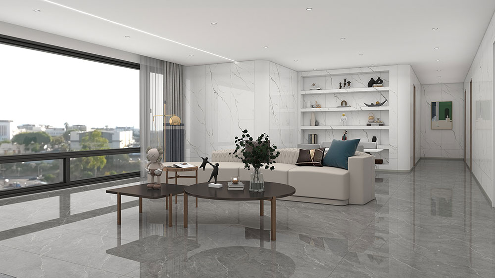 此客厅通过爱马仕灰岩板高端设计,空间通透明亮,视野开阔舒适,视觉层次更饱满,呈现高端氛围。