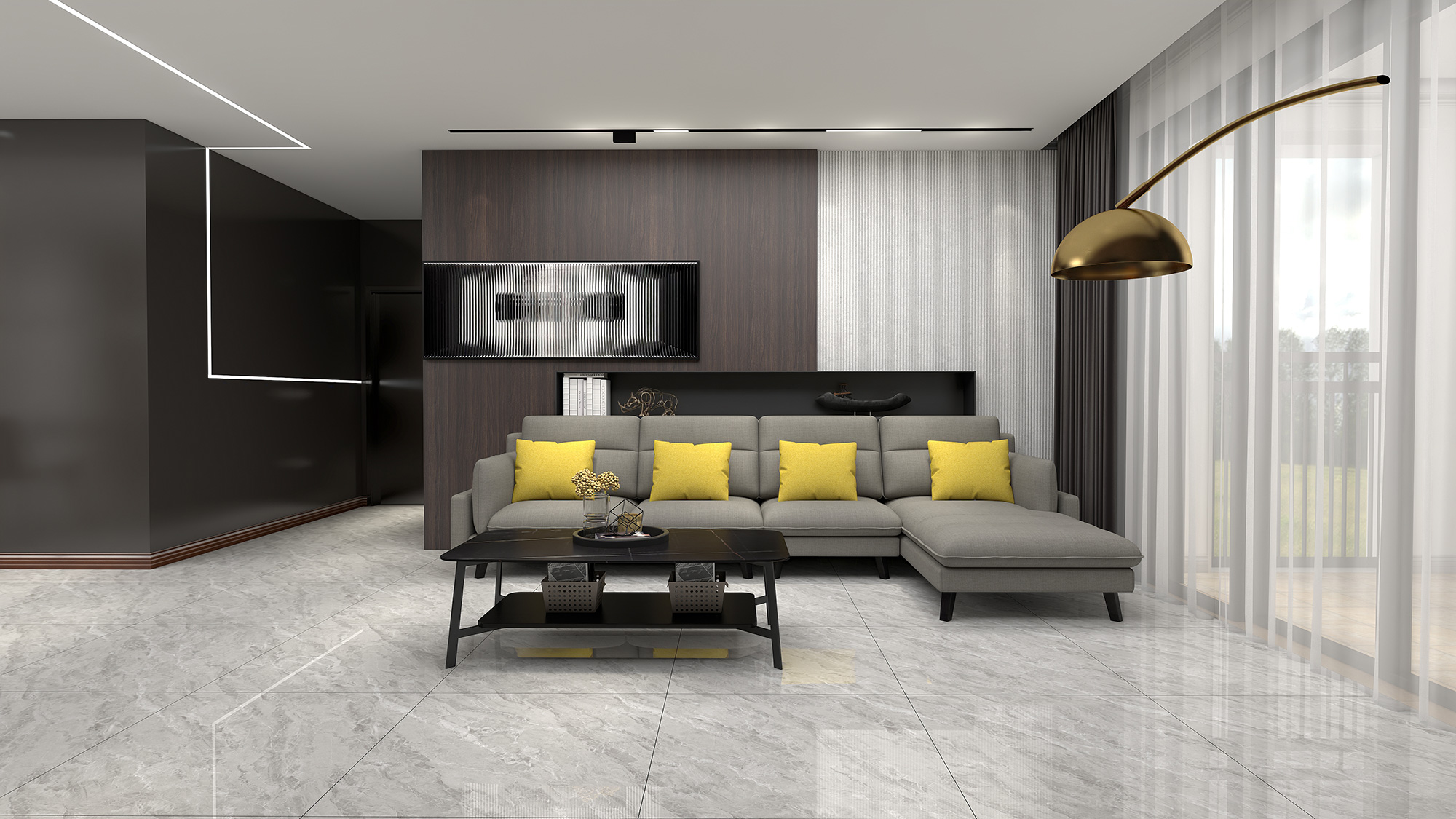 沉稳大气的蒙达尔,时尚且不可复制的纹理,自然逼真的肌理,丰盈的质感,深灰、浅灰和黄色组合在一起,雅奢的生活空间呼之欲出。