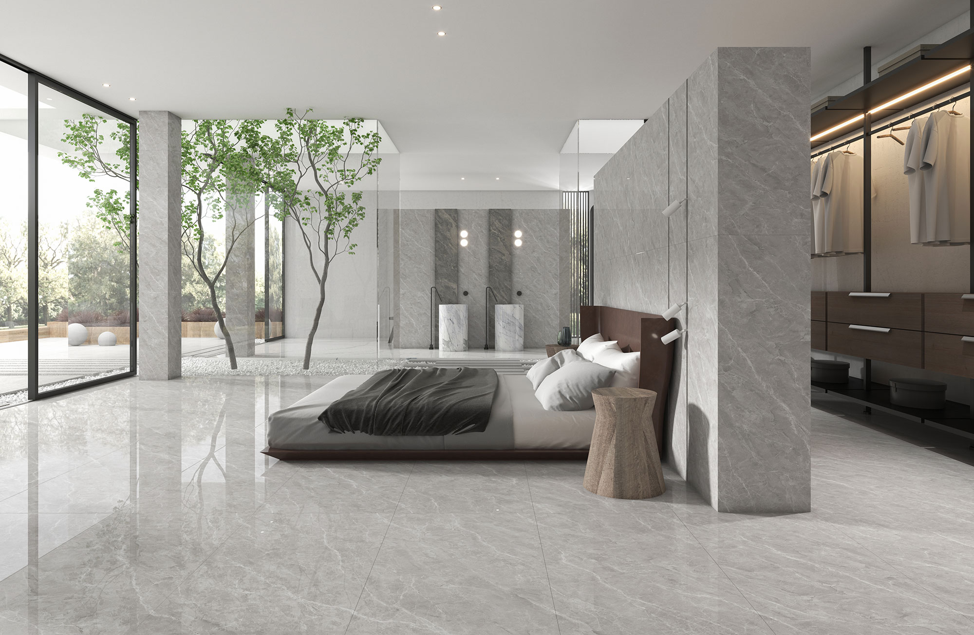 整体以灰色为主调,细微处又有深浅不一的层次对比,视觉丰富,灵活多变。德赫尼灰岩板,亮光质面让空间的光感更充足,开阔怡人,且表面细腻,增强了瓷砖纹理的表现力。