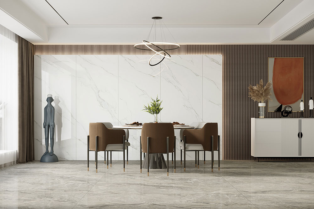 云山雾里大板,让整个空间充满现代时尚感,白色大理石墙面、深褐色餐椅、橙色艺术画、金属灯饰相得益彰,打造现代轻奢家居空间。