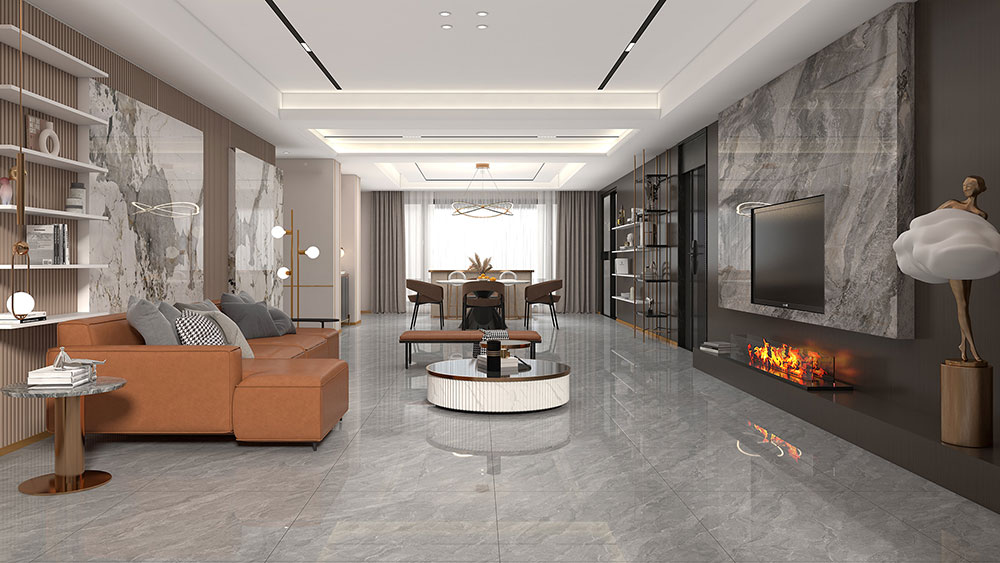 枫叶浅灰,细腻灵动的纹理,相互堆叠,层次分明,深邃典雅,铺陈出浓郁优雅的气质,搭配浪漫的棕色沙发及岩板背景墙,彰显出一份奢美与华贵。