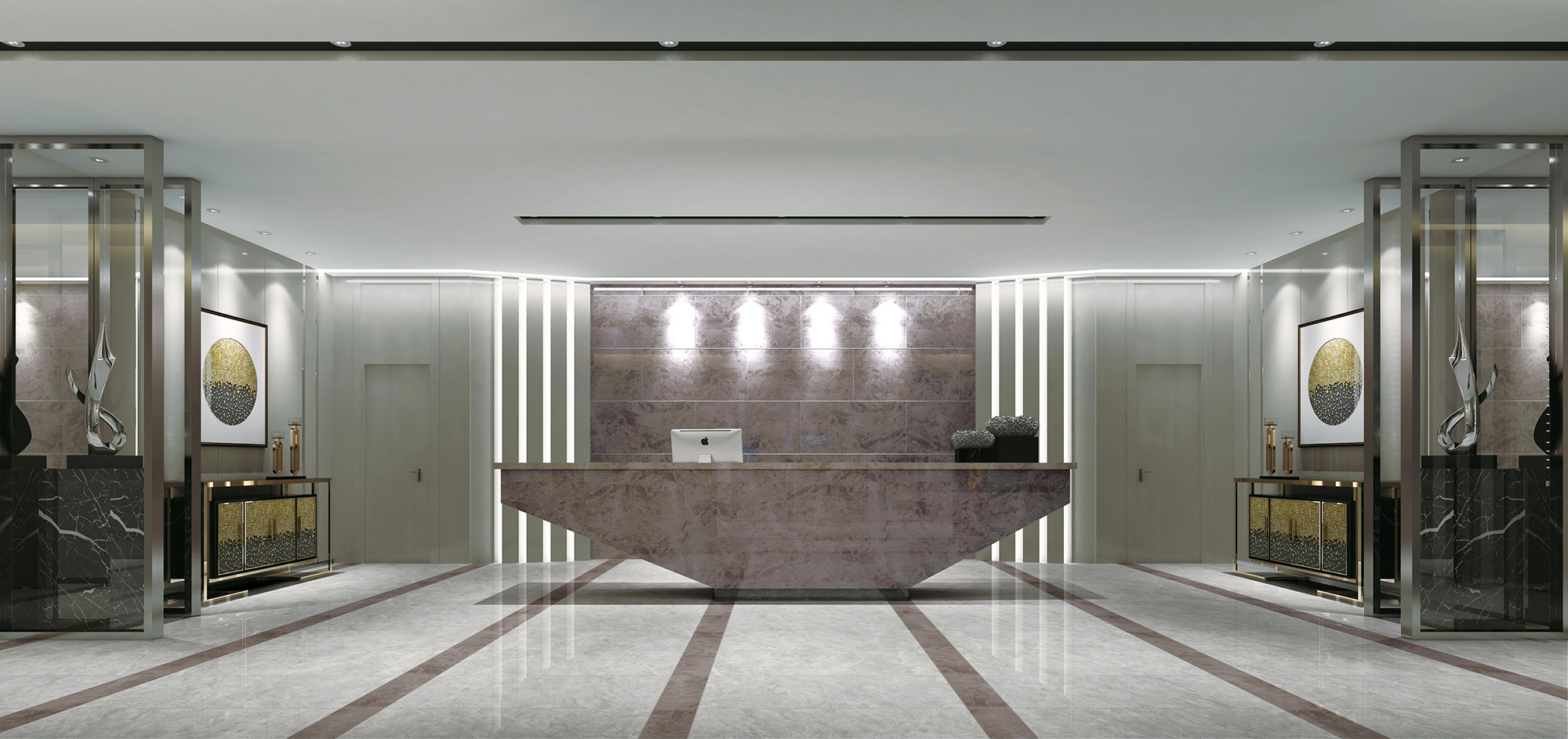 设计师运用摩卡灰大面积的精工密铺,搭配简单明亮的新现代装饰元素,简约而不失大气。