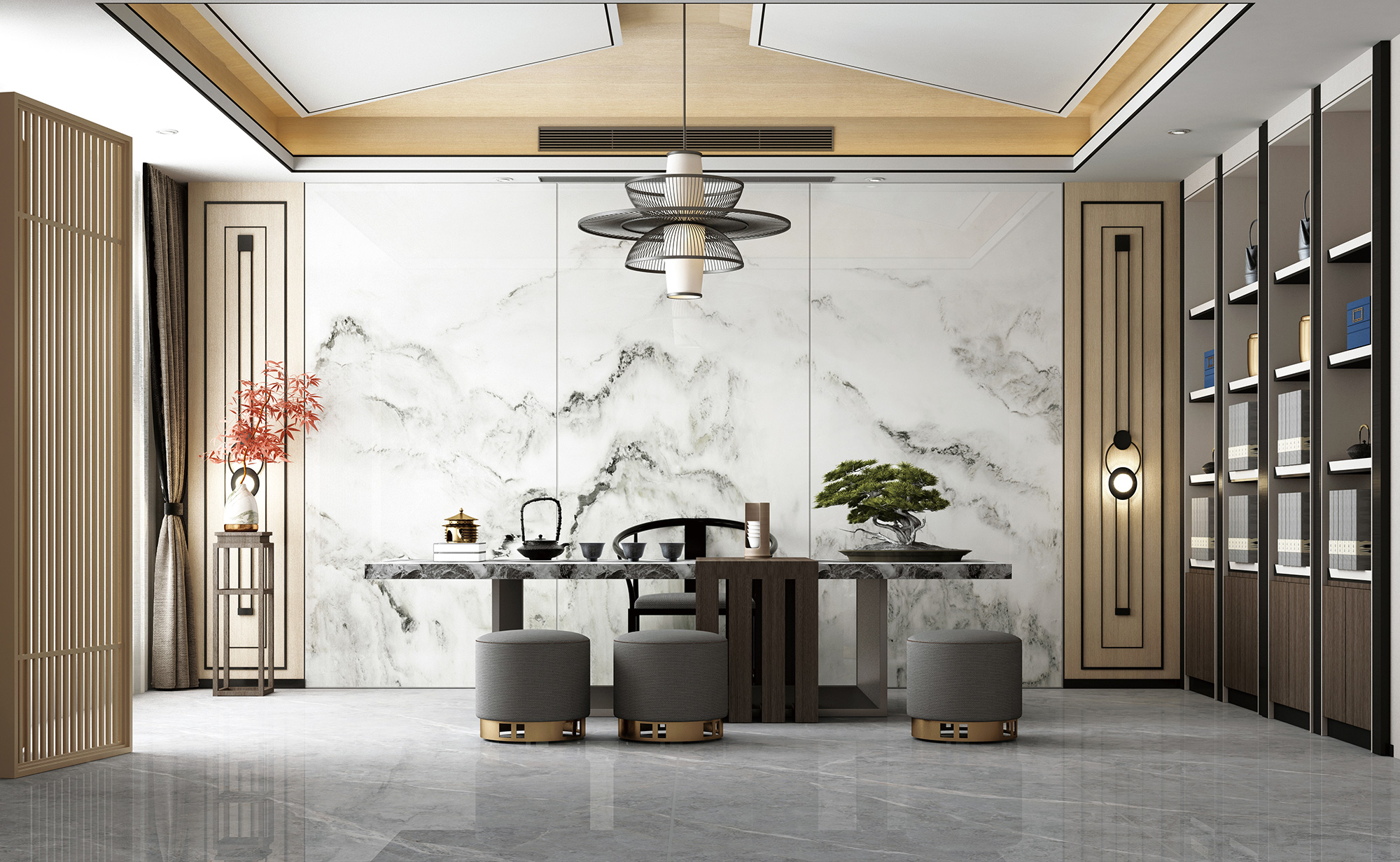 江山层层高岩板搭配充满禅意的家具,打造舒适的中式家居,绿色植物为空间增添自然淳朴,使此空间充满了惬意自然的味道,温馨舒适的宜居感,让您不得不爱!