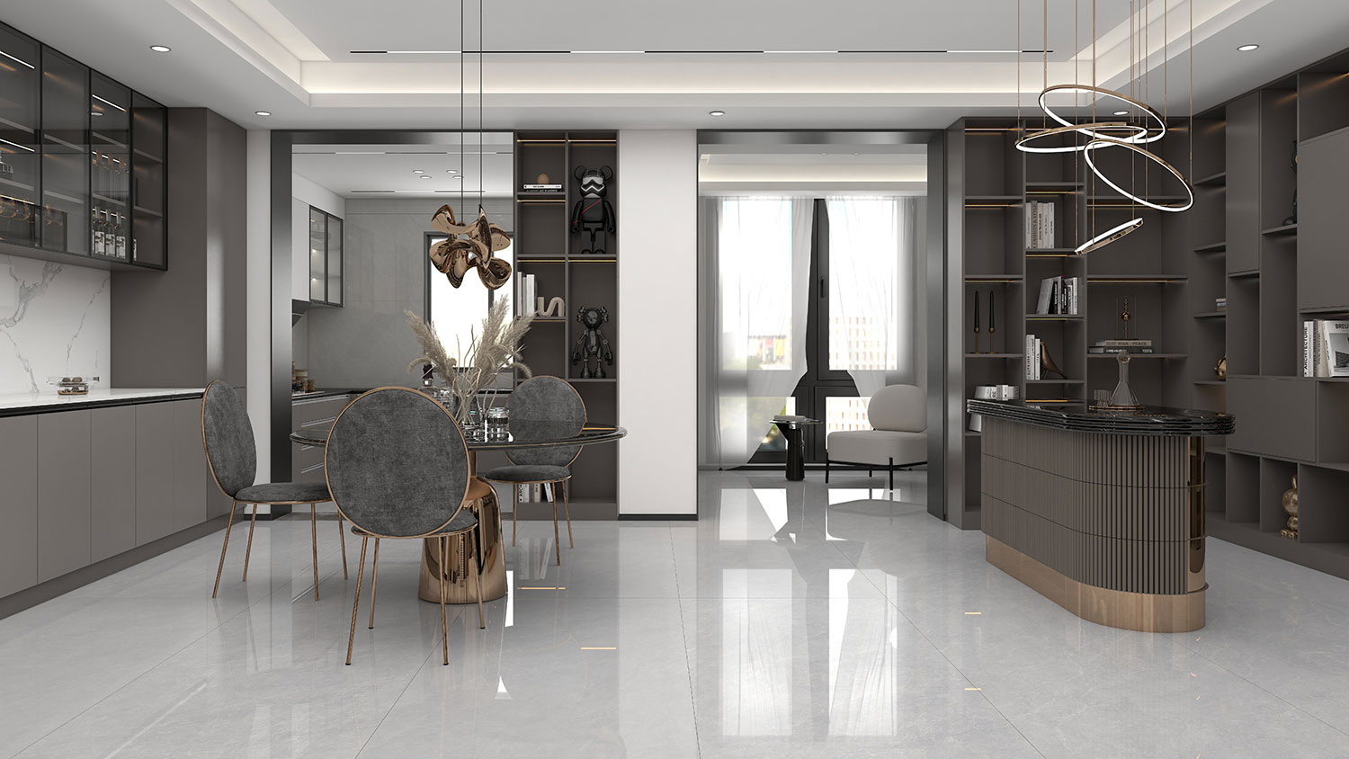 温柔清新的科亚灰半包裹了空间,不同深浅的灰色交织在一起,奠定了高雅的基调。华丽的吊灯与柔和的灯光构成一个高级的空间,充满质感。